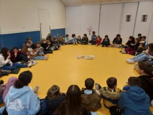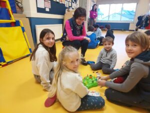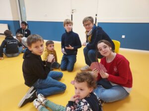 En effet, sur les temps de récré ces dernières semaines, des Cm2 volontaires allaient jouer avec les Ps-Ms à des jeux de plateau, de dés et de cartes. Ce lundi matin, tous les élèves se sont retrouvés pour jouer !