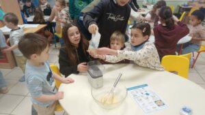 En parallèle, les autres groupes préparaient des pâtes à crêpes ; il fallait peser, mélanger, casser les œufs…puis les Cm2 ont participé à la cuisson.