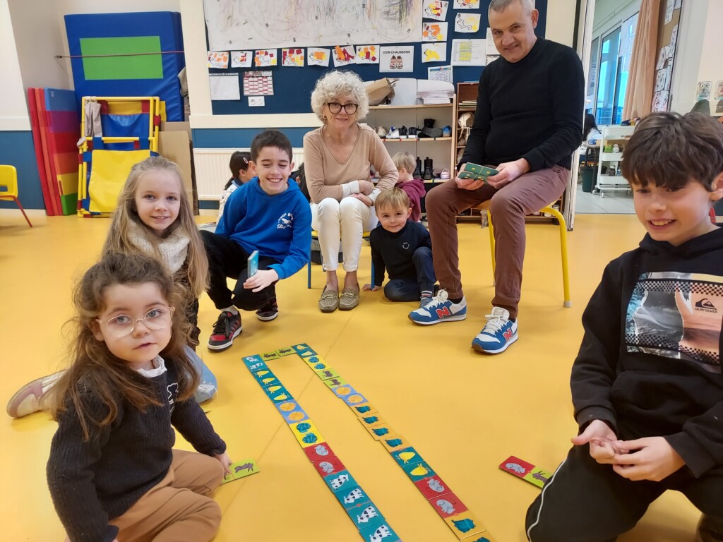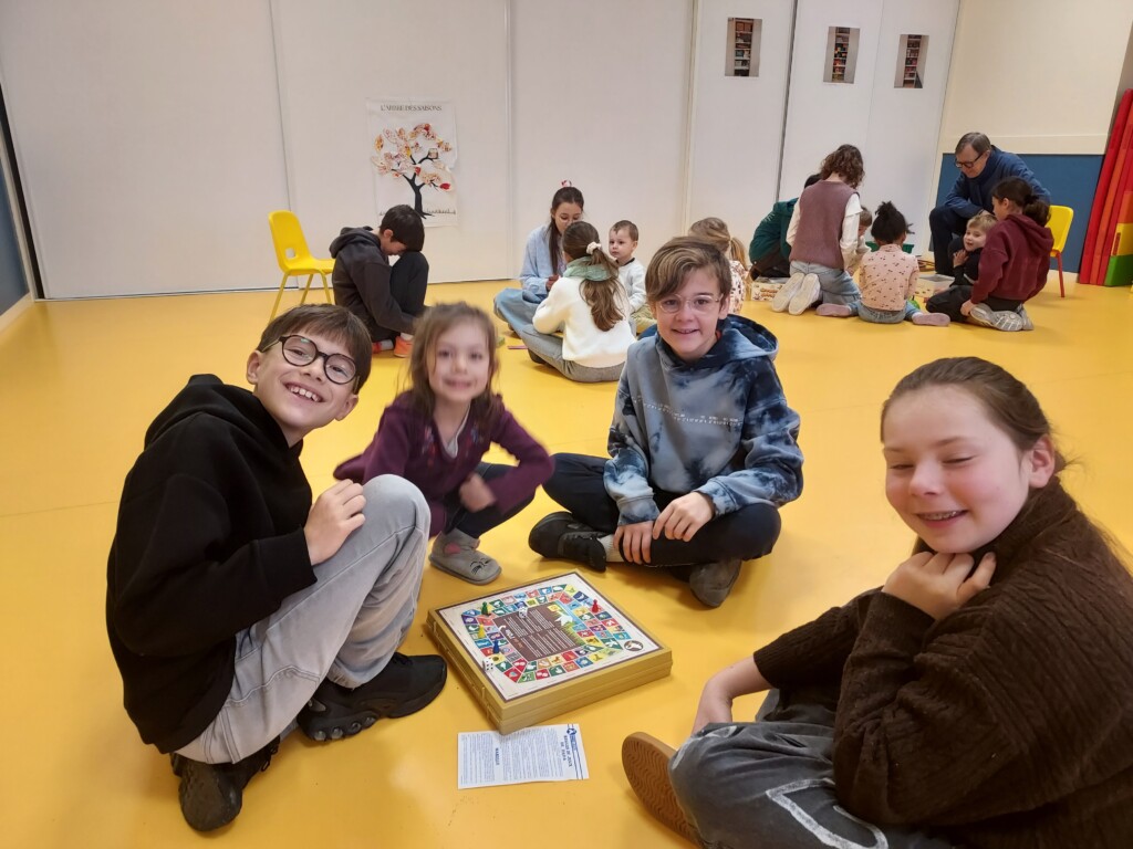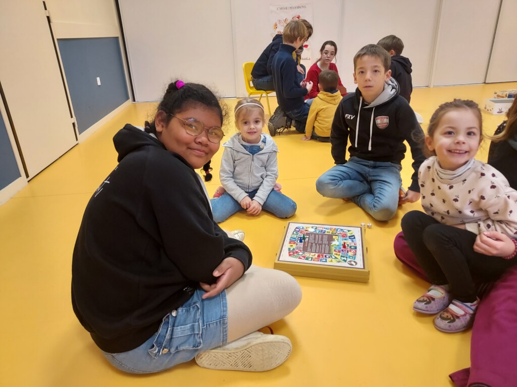 En effet, sur les temps de récré ces dernières semaines, des Cm2 volontaires allaient jouer avec les Ps-Ms à des jeux de plateau, de dés et de cartes. Ce lundi matin, tous les élèves se sont retrouvés pour jouer !