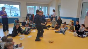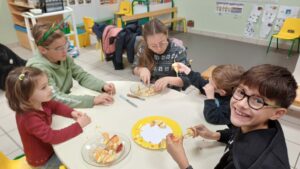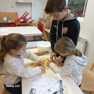 Mardi 16 décambre, les PS/MS de la classe de Suzie et les CM2 ont préparé des sablés de Noël et des brochettes de fruits. Ils ont ensuite partagé le goûter tous ensemble.
